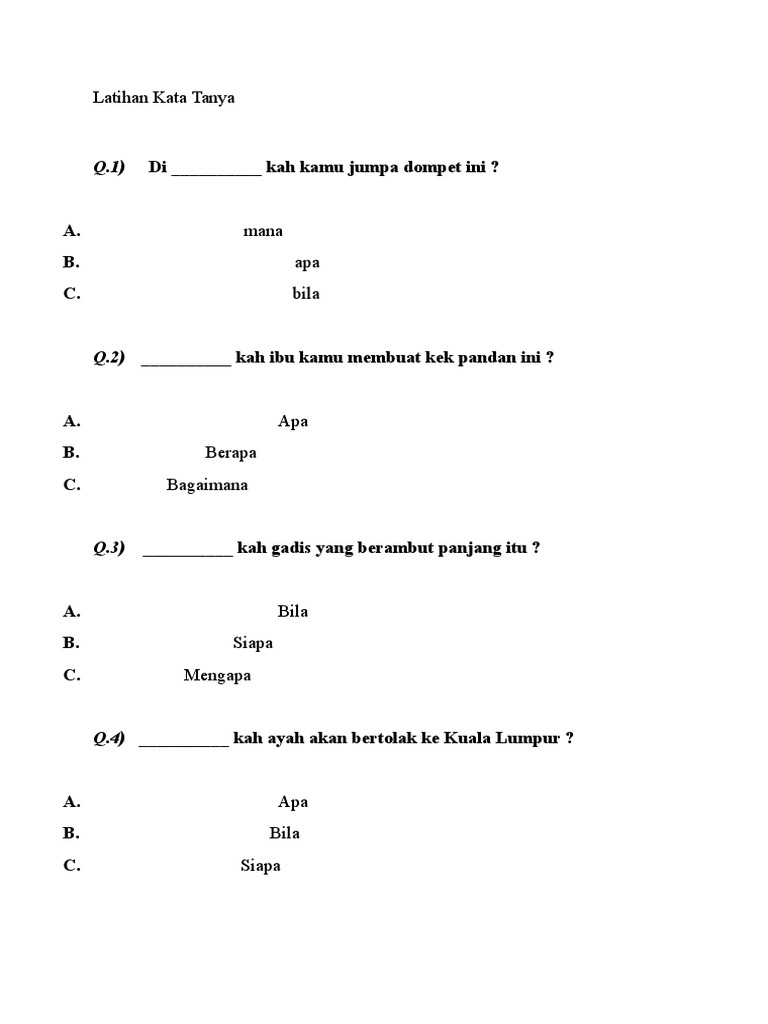 Adapun jawaban untuk kata tanya ini adalah suatu pengertian, keterangan ataupun penjelasan dari apa yang ditanyakan. You will be given 10 seconds per question. ( ) encik halif adalah pekerja di sebuah syarikat yang besar. Kata tanya mesti diikuti oleh partikel 'kah' apabila digunakan di 4. Kata tanya bahasa melayu tahun 2 musim pkp beserta kuiz. For more information and source, see on this link : Di kah ayah meletakkan keretanya ? Kah perdana menteri malaysia ? Kah nama arnab kesayangan kamu ? Bahasa malaysia tahun 2 kata tanya. Jawaban atas kata tanya ini dapat berupa jam, hari, tanggal, bulan, tahun ataupun lamanya sebuah kejadian. Tatabahasa online worksheet for tahun 2. ( ) guru kelas tahun 2 saya ialah puan chin.