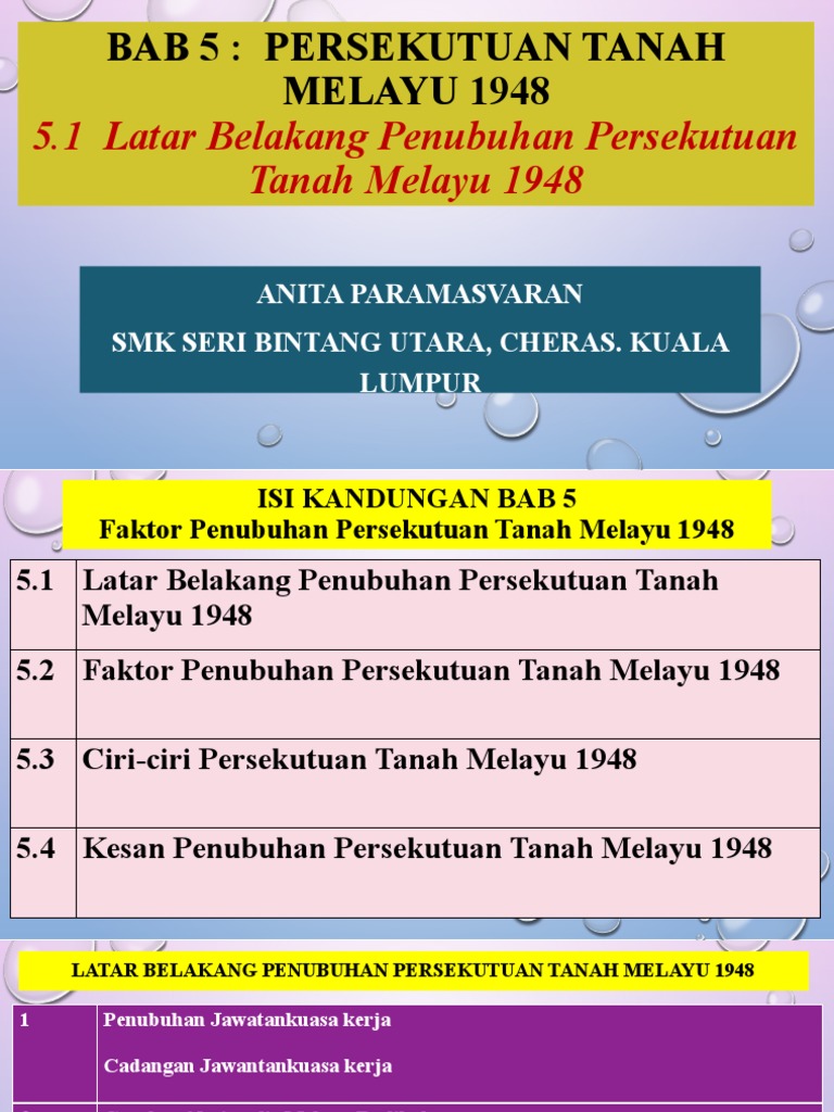 Nota Sej Bab 4 T5 09 from image.slidesharecdn.com Perpaduan orang melayu yang terdiri daripada golongan raja dan rakyat 3. A) faktor pembentukan persekutuan tanah melayu 1948. Dibentuk kerana desakan daripada orang melayu kepada british yang menginginkan perubahan di dalam bidang politik di tanah melayu. Penentangan meluas dari seluruh orang melayu menyebabkan british membatalkan perlembagaan malayan union dan menggantikannya dengan perlembagaan persekutuan tanah melayu 1948.rundingan antara penjajah british dengan. Persekutuan tanah melayu q jus soli hanya terbuka kepada rakyat raja dan rakyat british q ke tanah melayu pada tahun 1936 iaitu 12 tahun sebelum perjanjian persekutuan tanah melayu 1948 ditandatangani. 3.2.2 perbezaan malayan union dengan persekutuan tanah melayu 1948. The malay language (bahasa melayu) apabila dap memerintah. Orang melayu berjaya memujuk dan mendesak british menghidupkan semula dasar.