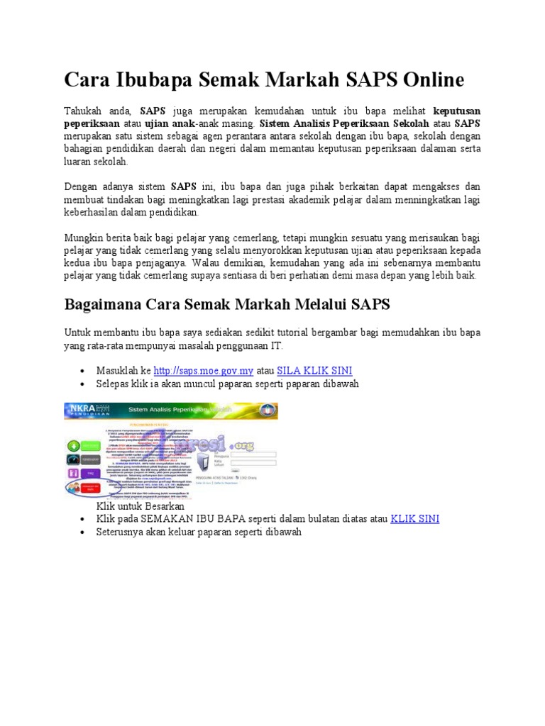 Sistem saps ibu bapa ini akan memaparkan slip keputusan, markah peperiksaan serta kedudukan pelajar dalam kelas. Saps ibu bapa 2020 semakan keputusan peperiksaan merupakan sistem yang diwujudkan oleh pihak kementerian pendidikan malayisa bagi memudahkan. Pasti ramai ibu bapa dan penjaga murid yang sudah tahu apa itu sistem analisis peperiksaan sekolah. Sistem analisis peperiksaan sekolah telah dibangunkan bertujuan untuk mengumpul, menyimpan dan menganalisis data peperiksaan dalaman setiap. Cara semak keputusan peperiksaan secara online?