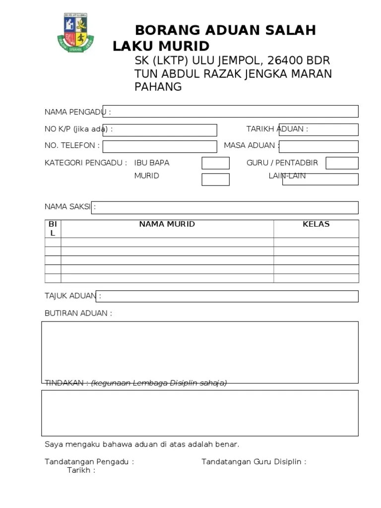 Berikut merupakan borang maklumat murid yang telah dihasilkan berdasarkan aplikasi pangkalan data murid apdm. Borang aduan salahlaku disiplin pelajar maklumat laporan ( perlu dipenuhkan oleh pelapor atau pengadu) nama pelajar no kpt no pendaftaran jabatan unit disiplin sektor hal ehwal murid bahagian pengurusan sekolah harian kementerian pendidikan malaysia aras 3 & 4, blok e2, parcel e, 62604. 441 571 murid selepas 3 tahun persekolahan. Membuat laporan di dalam buku laporan bertugas yang disediakan dan kalau perlu laporkan terus kepada 5.1 mengagihkan borang spbt 1 bagi mengenalpasti murid yang layak mendapat skim. Secara umum, murid itu berarti seseorang yang mau belajar dan menuntut ilmu untuk meningkatkan kemampuan diri.