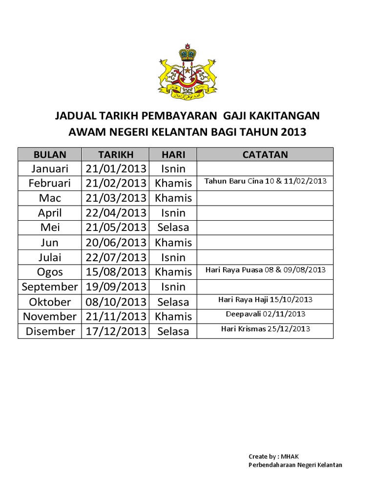 Tarikh pembayaran gaji bulanan kakitangan awam ini terpakai untuk semua negeri di seluruh malaysia. Untuk memudahkan i merancang kewangan i sepanjang tahun 2020 nanti. Jadual dan tarikh pembayaran gaji penjawat awam tahun 2019. Untuk kemudahan semua penjawat awam, berikut adalah jadual pembayaran gaji 2021 kakitangan awam/ kerajaan untuk rujukan semua. Bilakah tarikh pembayaran gaji tahun 2021 kakitangan awam/ kakitangan kerajaan hujung bulan? Maka, bolehlah para penjawat awam membuat tanda. Berikut adalah lampiran jadual pembayaran gaji bulanan kakitangan awam / penjawat awam bagi tahun 2020 mengikut tarikh gaji sepertimana yang lampiran dibawah mewakili satu tarikh gaji untuk kementerian dan jabatan semua negeri. Semua penjawat awam atau kakitangan awam kerajaan malaysia boleh mendapatkan maklumat mengenai gaji kakitangan awam 2021 dengan merujuk. Moga jadual dan tarikh gaji bulanan 2021 kakitangan awam ini dapat membantu anda dalam merancang percutian atau balik kampung sesuai dengan kalendar. Jadual gaji bulanan penjawat awam ini tertakluk kepada. Jadual dan tarikh gaji 2021 kakitangan kerajaan. Bilakah tarikh pembayaran gaji 2020 atau jadual gaji 2020 bulanan penjawat awam / kerajaan? Jadual pembayaran gaji ini dikongsi berdasarkan jadual rasmi yang dikeluarkan oleh pejabat akauntan negara malaysia (anm).