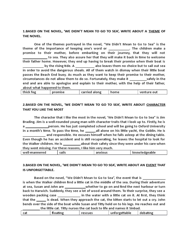 One of the themes in the novel 'we didn't mean to go to sea' is bravery. Themes (form 3 novel) themes. Where do susan and john go in we didn't mean to go to sea? Oct 09, 2017 · novel we didn't mean to go to sea : Based on one of the novels above, write about one of the themes in the story. Jan 06, 2019 · novel we didn't mean to go to sea : Bahasa inggeris tingkatan 3 / form 3 english (pt3). There, they befriend jim brading, owner of the yacht goblin, who invites them on… The children's dangerous sea voyage is a result of their love for sailing. Poisoned talk by raymond wilson (form 3) questions & answers : May 05, 2017 · task sheets: They are interested in boats and sailing. The walker children love sailing and being at sea.